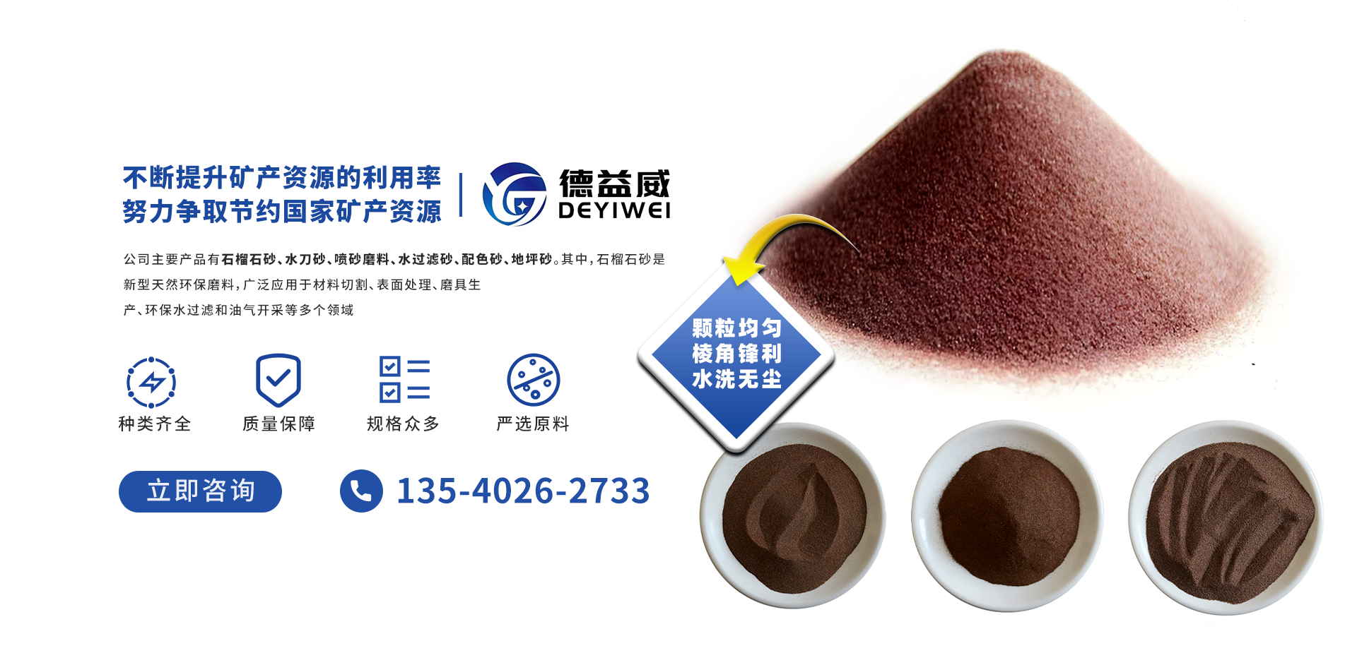 成都德益威機電設備有限公司是一家擁有豐富磨料礦產的企業,,經過近10年的發展,擁有豐富的礦產儲備、擁有專業的生產線設備、強大的技術力量、能及時的滿足客戶大量訂單的需求。         公司主要產品有石榴石砂、水刀砂、噴砂磨料、水過濾砂、配色砂、地坪砂。其中,石榴石砂是新型天然環保磨料,廣泛應用于材料切割、表面處理、磨具生產、環保水過濾和油氣開采等多個領域;其細粉是精密拋光工藝不可缺少的重要原材料,其產品在光電、軍工、航天、航空、機械、等領域均有廣泛應用;         公司始終堅持“服務客戶,合作共贏”的經營理念,不斷提升礦產資源的利用率,努力爭取節約國家礦產資源。